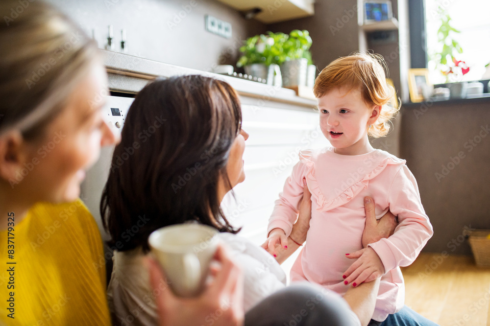 Mother, grandmother and little granddaughter in kitchen, sitting on floor. Family time, three generations of women in family.
