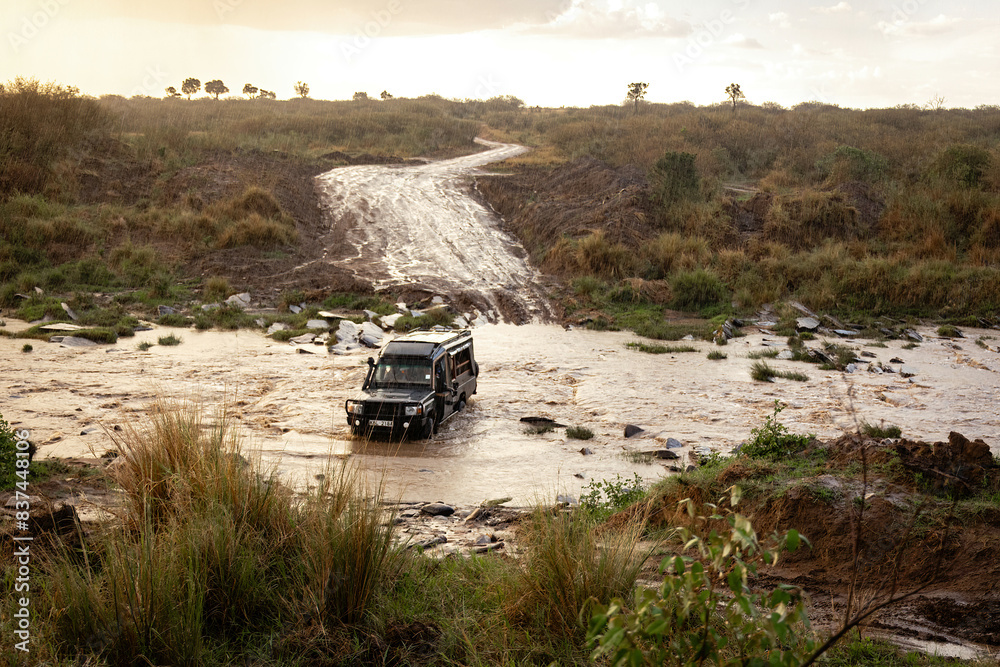 Safari vehicle crossing rushing river during rain storm