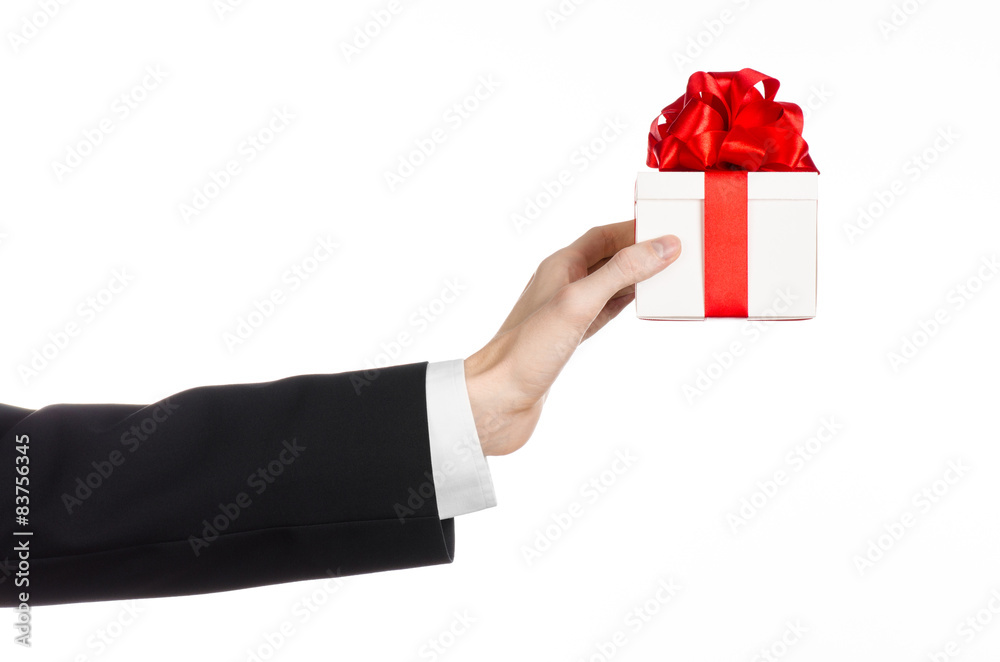 man in a black suit holding gift wrapped in white box in studio