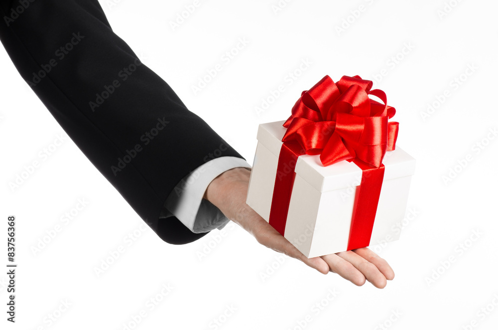 man in a black suit holding gift wrapped in white box in studio