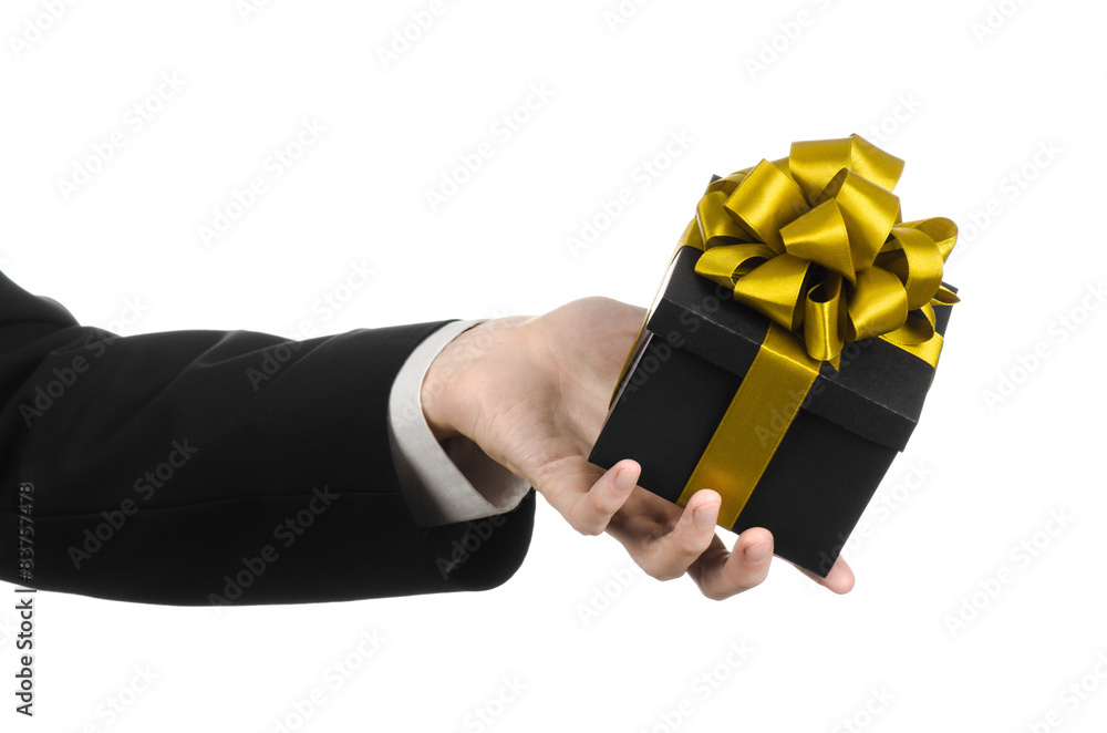 man in a black suit holding gift packaged in a black box