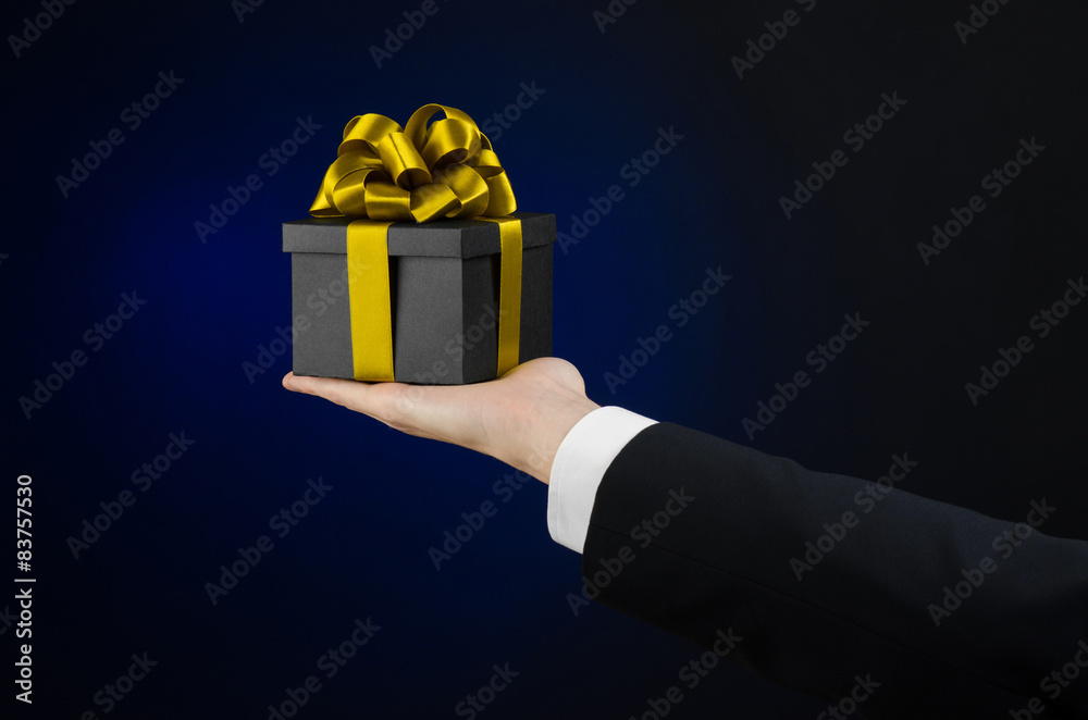 man in a black suit holding gift packaged in a black box