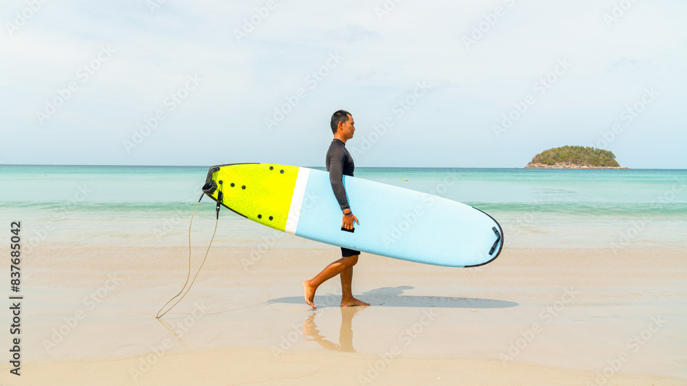 Confidence Asian man enjoy outdoor active lifestyle water sports surfing on summer holiday vacation. Healthy guy in wetsuits holding surfboard walking together on tropical beach in sunny day.