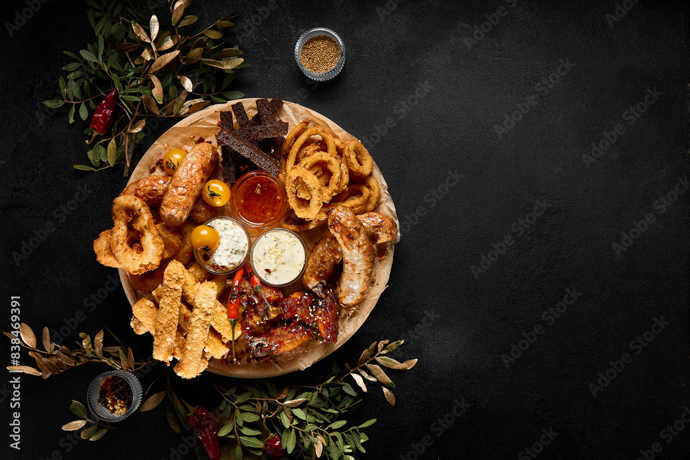Assorted Beer Snacks Platter with Toasts, Sausages, Fried Calamari, Onion Rings, and Buffalo Wings on Dark Background