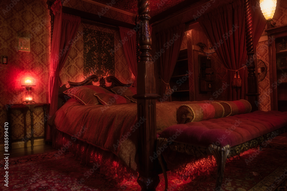 This image shows the interior design of a red victorian, bordello themed bedroom, facing the window covered with dramatic curtains.