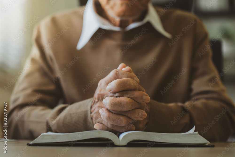 Old man's hands folded in prayer on a Holy Bible in church concept for faith, spirituality, and religion. Old man praying to god for happiness and a better life. believe in goodness. Hope.