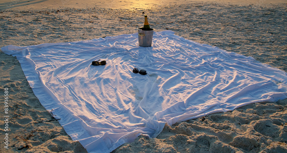 champagne and sunglasses on the beach at sunset