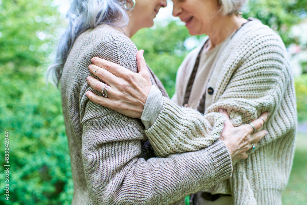 A middle-aged lesbian couple embraces each other warmly while wearing cardigans, surrounded by lush green trees.