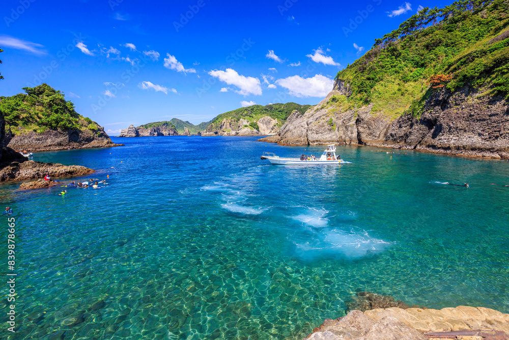 Skin divers take to the sea on a fishing boat on the ferry to Hirizohama beach.