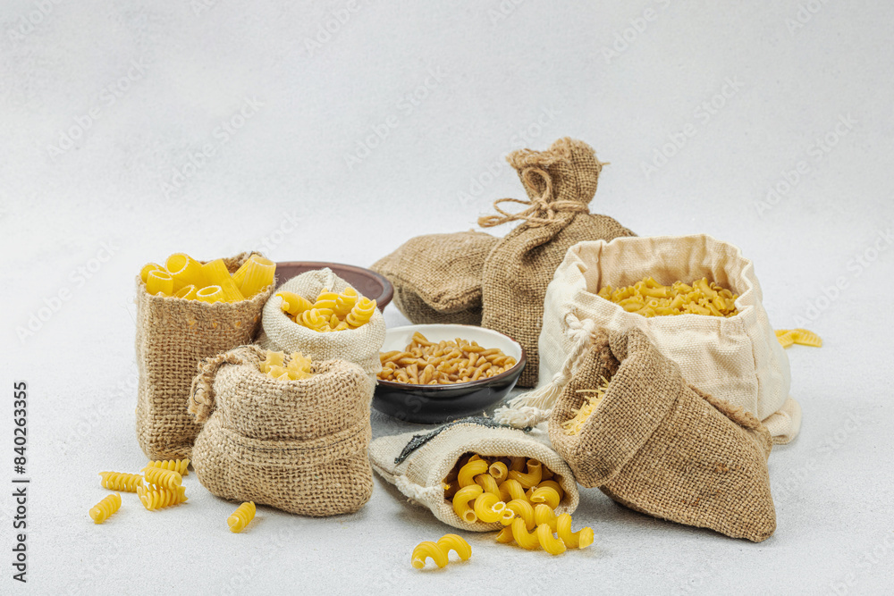 Pasta. Various kinds of uncooked pasta and noodles over light stone background. Traditional Italian