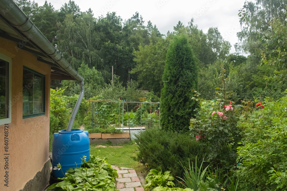 Blue rainwater barrel connected to a downspout on the side of a rural house, surrounded by lush green foliage and garden path. Rain water harvesting architecture.
