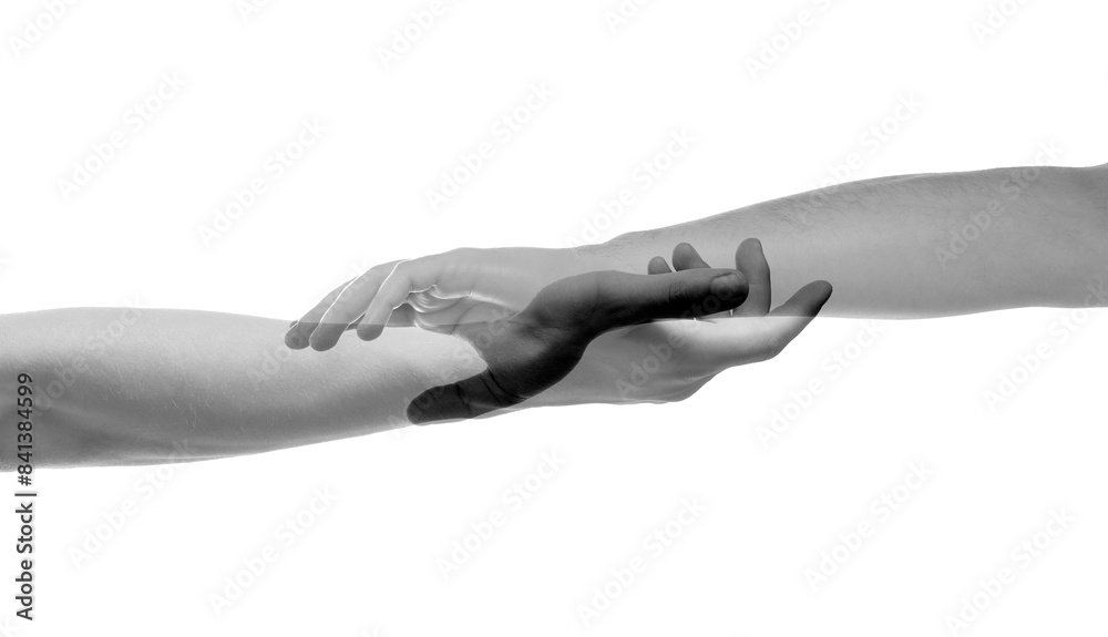 Double exposure of people's hands on white background, closeup. Black and white effect