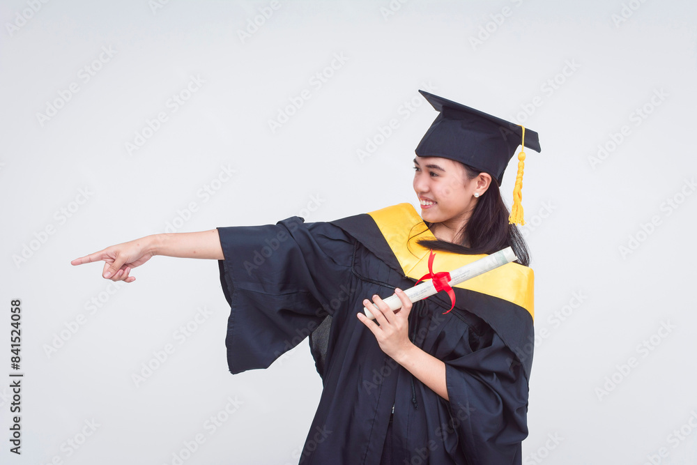 A happy female graduate of bachelor of science holding her diploma pointing to the left. Isolated on a white background.