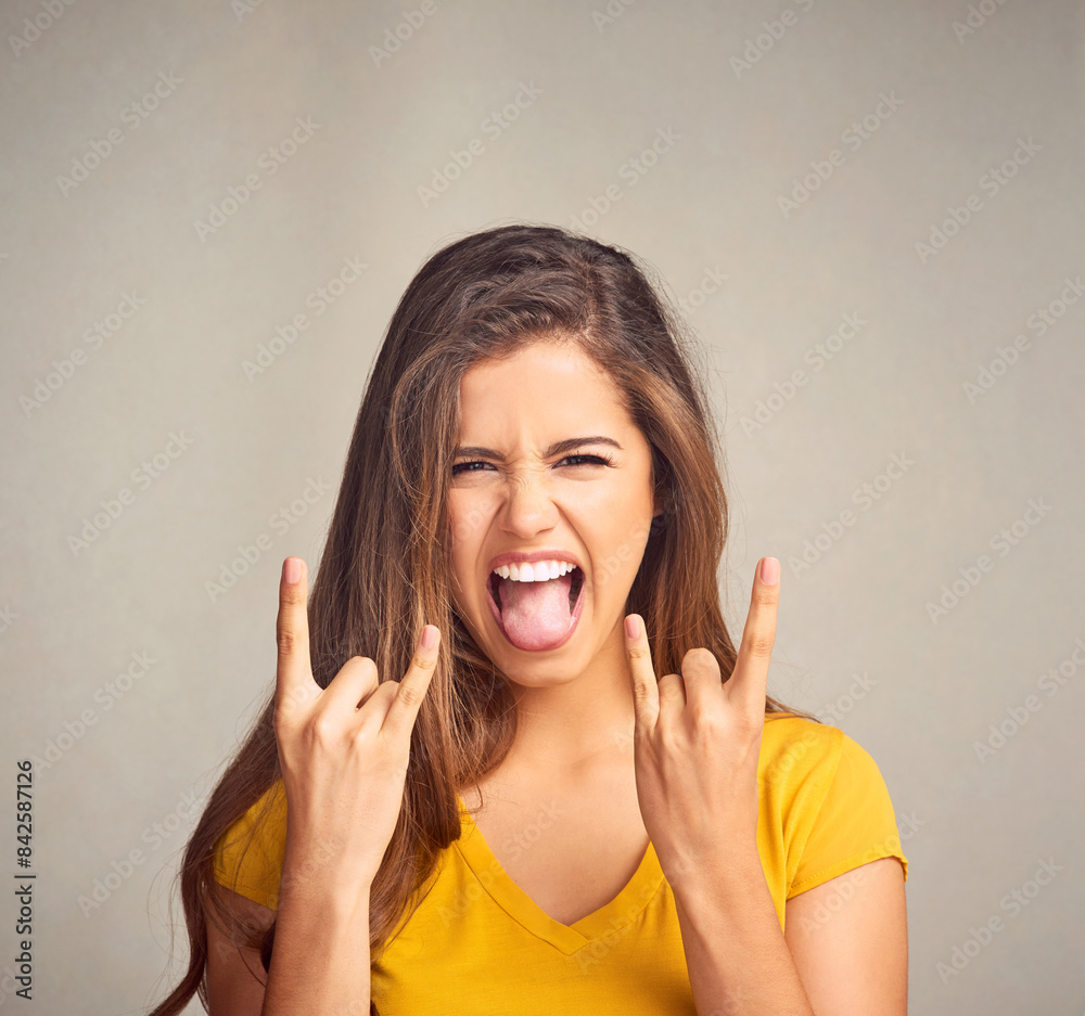 Woman, portrait and hand gesture with rock n roll in studio for grunge sign, rockstar or devil horns on white background. Crazy, aesthetic and female model for emoji, punk icon or rebel symbol