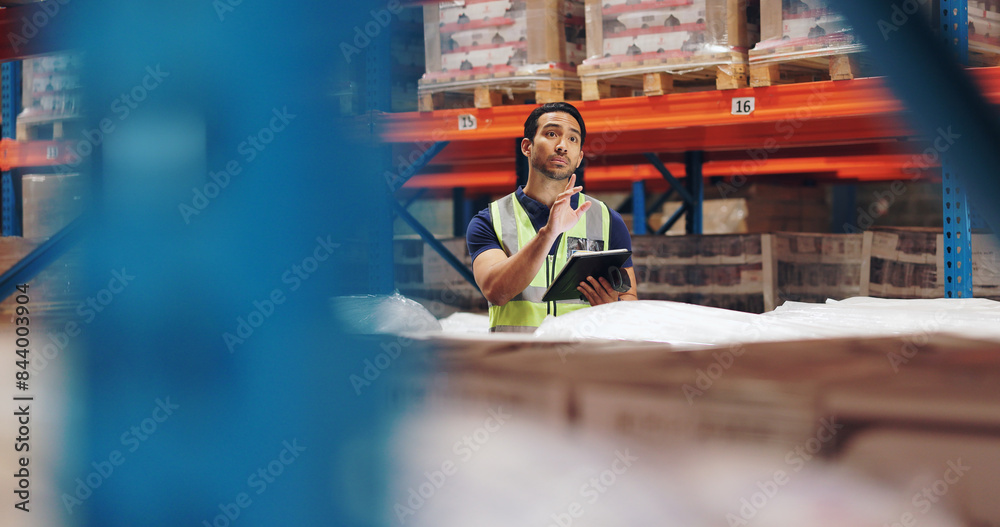 Man, tablet and inventory or warehouse inspection of cargo for ecommerce shipping, factory or production. Distributor, online and logistics service in storehouse for package, courier or planning