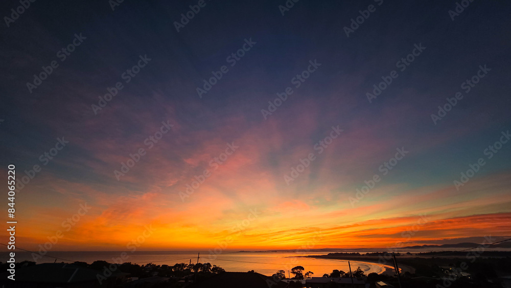 A vibrant sunrise with hues of pink, orange, and yellow unfurls across a blue sky above a reflective ocean.