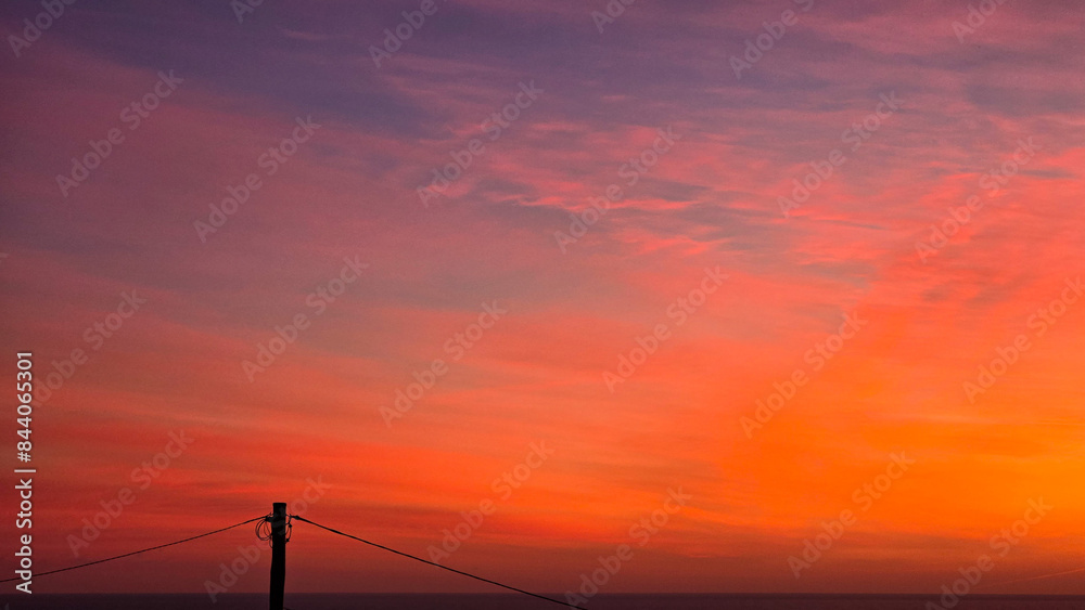 A vibrant sunrise with hues of pink, orange, and yellow spreads across a blue sky behind a telephone pole's silhouette.