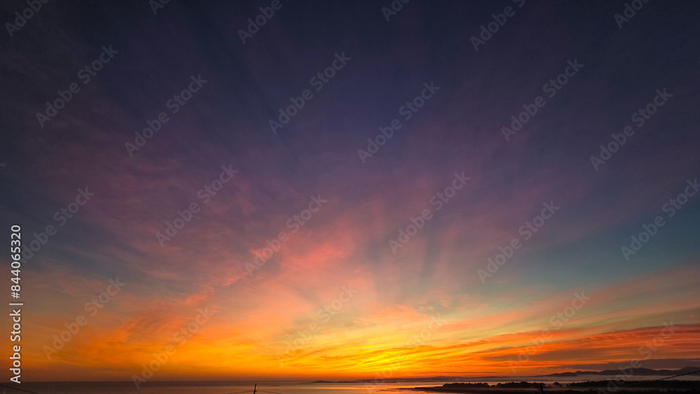 A vibrant sunrise with hues of pink, orange, and yellow unfurls across a blue sky above a reflective ocean.