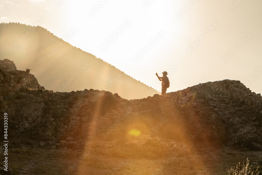 Archeologist exploring ancient ruins on top of mountain at sunset