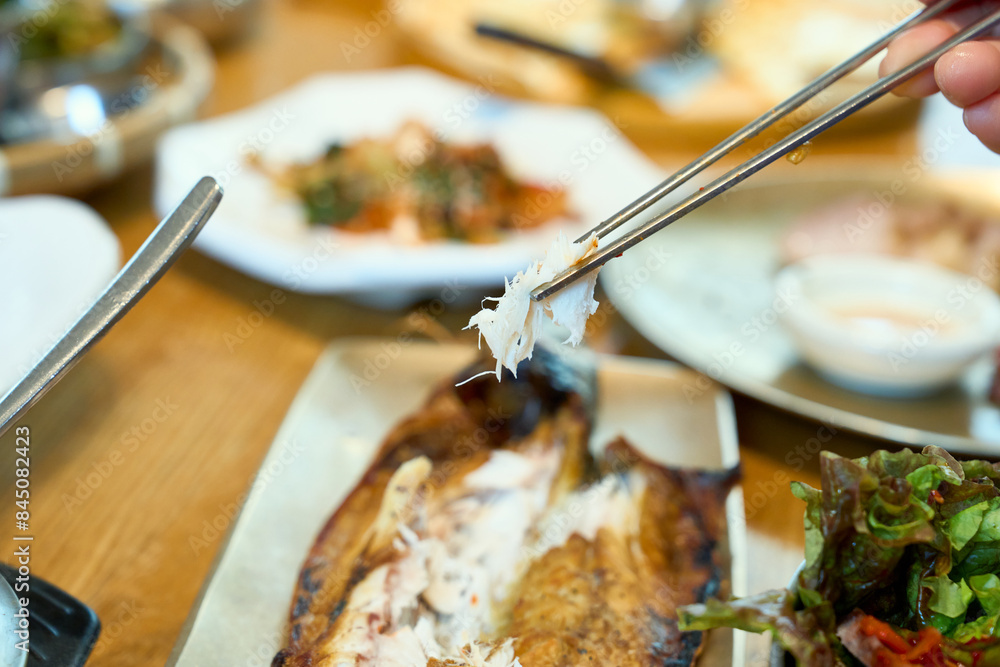 식탁 위에 놓인 고등어 구이 맛있게 먹는 모습