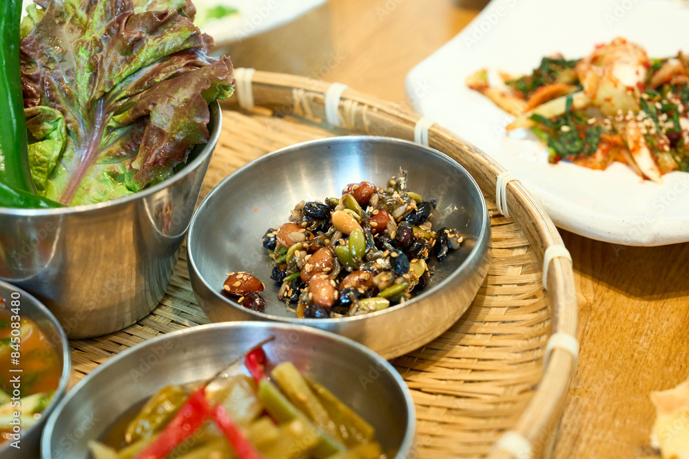 식탁 위에 반찬과 야채들이 놓여있는 모습