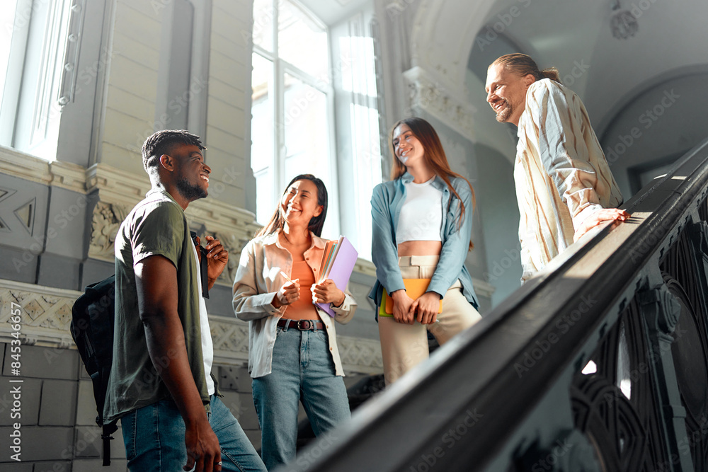 College students bonding in a historic building stairwell on campus, creating a lively atmosphere