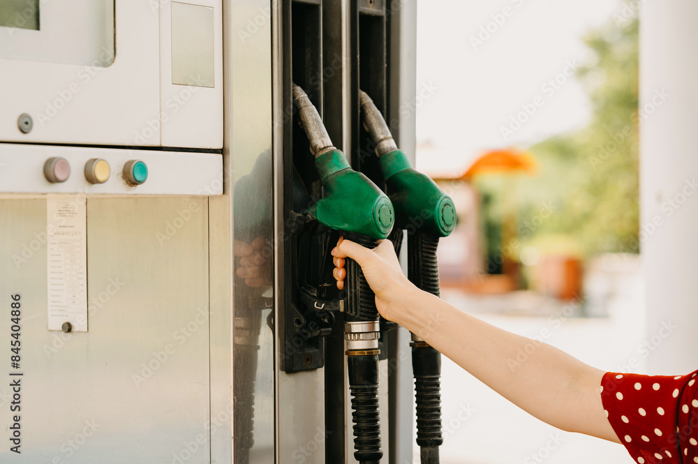 At a gas station, a persons hand is holding a green petrol pump nozzle, getting ready to refuel a vehicle