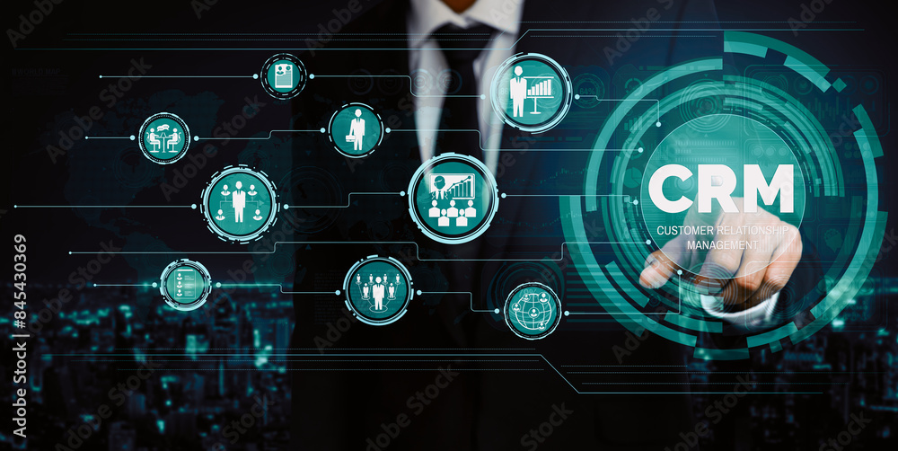 CRM Customer Relationship Management for business sales marketing system concept presented in futuristic graphic interface of service application to support CRM database analysis. uds