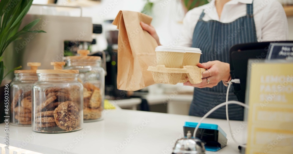 Barista, customer and takeaway coffee or giving at counter as breakfast order, morning or espresso. Person, hands and cafe shop or lunch beverage for small business food at bakery, latte or drink