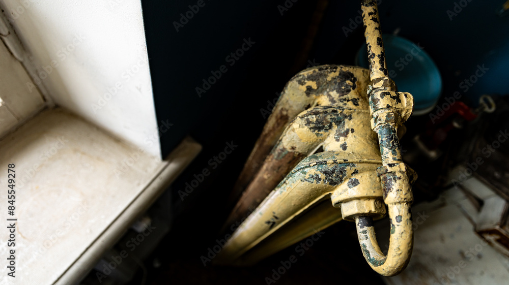 An old, rusty water pump in an abandoned building, showing signs of decay and neglect