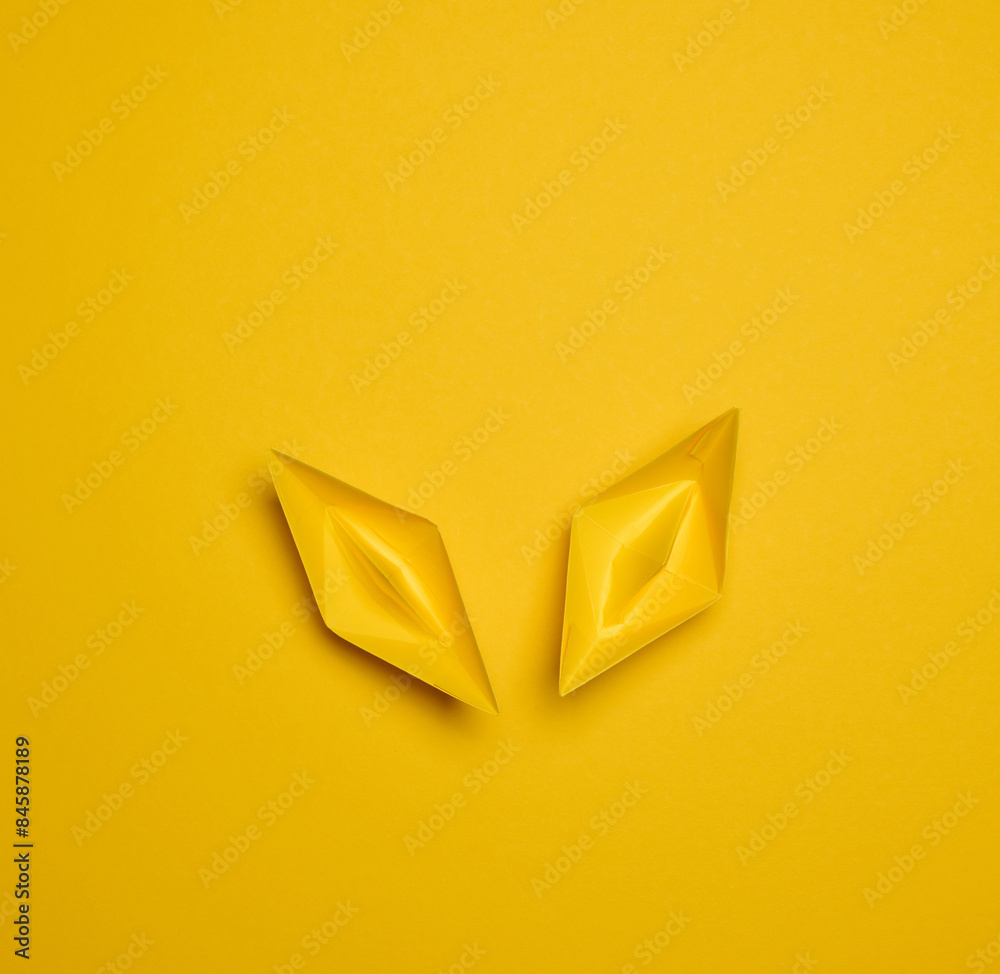 Paper boats sail in different directions on a yellow background. the concept of leadership, achieving goals and disunity
