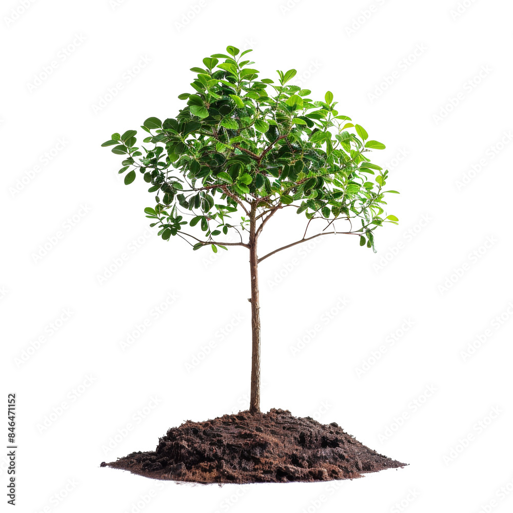 A young, green tree sapling planted in fresh soil, symbolizing growth, nature, and environmental conservation on a white background.
