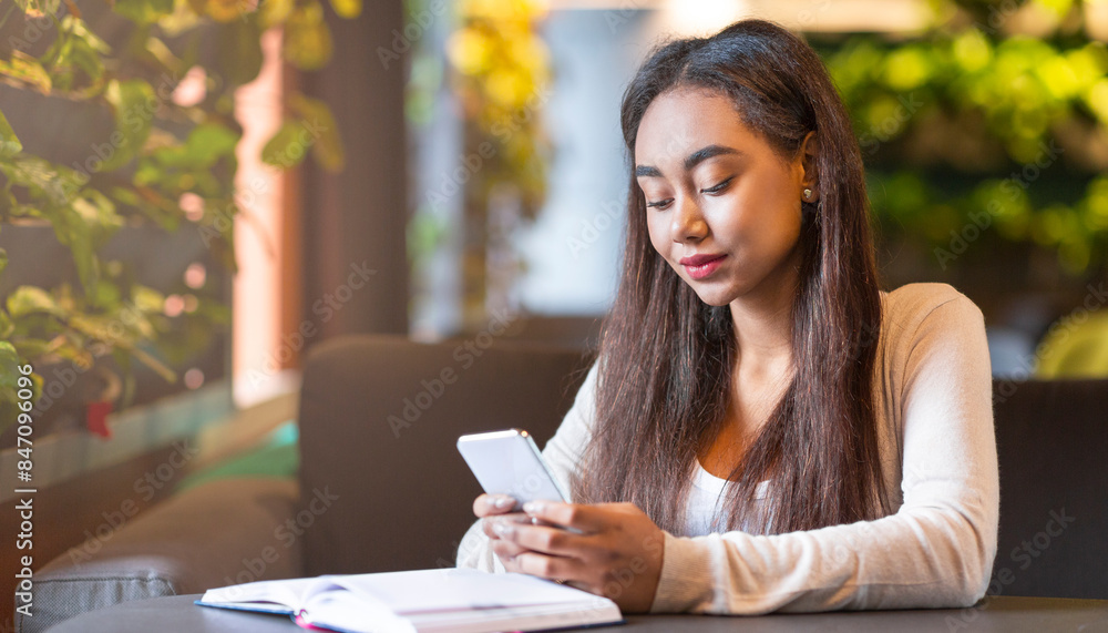 A young black girl is seated at a table, engrossed in looking at her phone. She appears focused on the screen, with a slight expression of concentration.