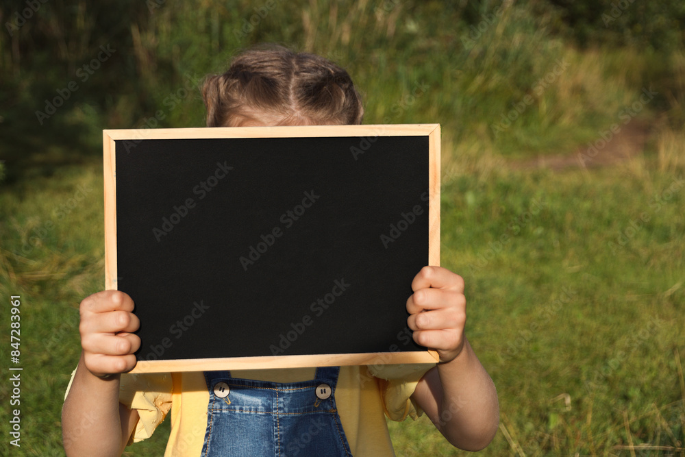 Black chalk board mocap in hands of a 5-year-old unrecognizable girl without face in summer