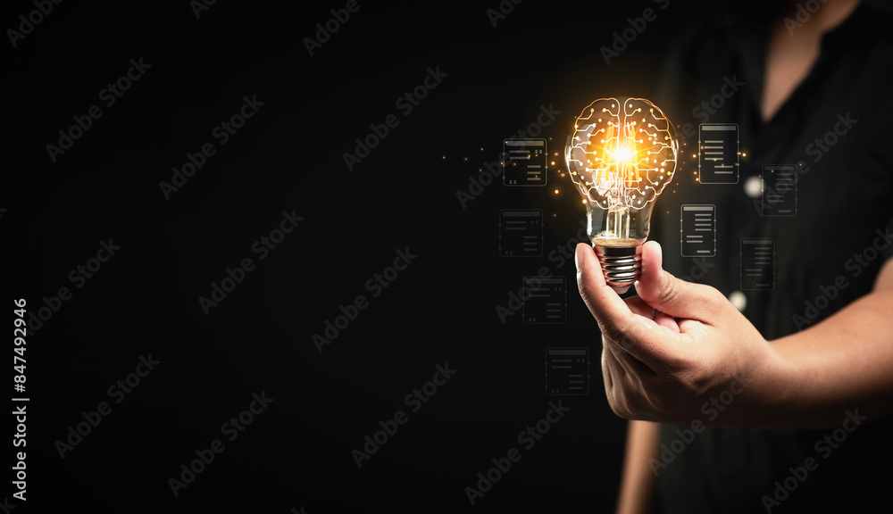 Hand holding a bulb with a brain icon while standing on a black background.