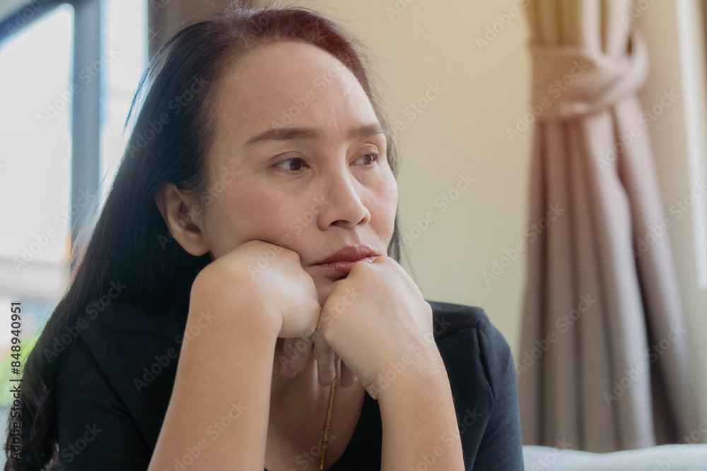 Depressed Asian woman sitting on sofa in livingroom and looking through window at home.