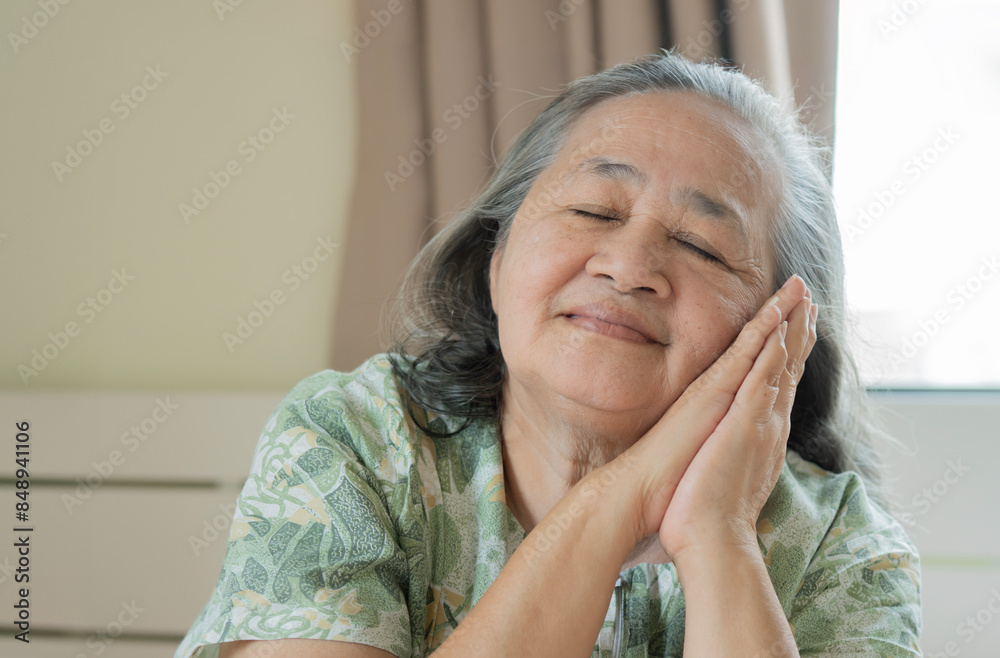 Portrait of attractive cheerful dreamy grey-haired Asian woman resting sleeping fantasizing
