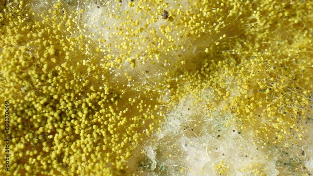 Zoom in, bread reveals its fungal conquest. Yellow and white fuzz sprawl like miniature landscapes, while black specks hint at the inevitable spread of mold colonies. Fungal background.