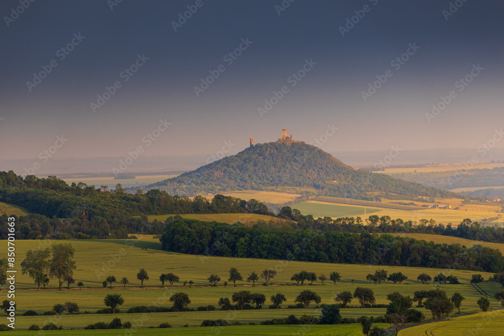 Ceske stredohori, north Czech hill landscape at dramatic sunset light with ruin of castle Hazmburk