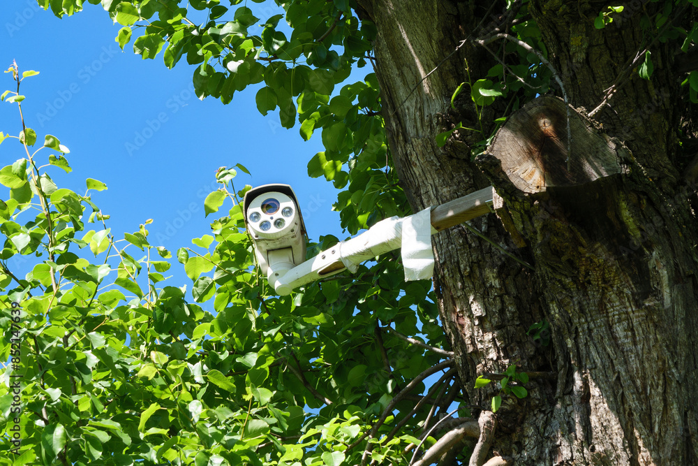 A white security camera is mounted on a tree branch, with the camera lens facing forward. A hidden camera in nature.