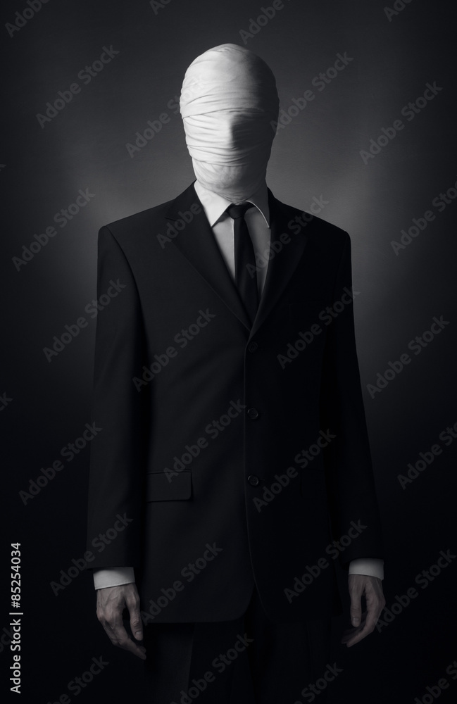 Internet meme and terrible character Halloween theme: very tall burly man with long arms in a suit with bandaged face fabric, an unknown killer in the suit, The Slender Man, Secret legend of the city