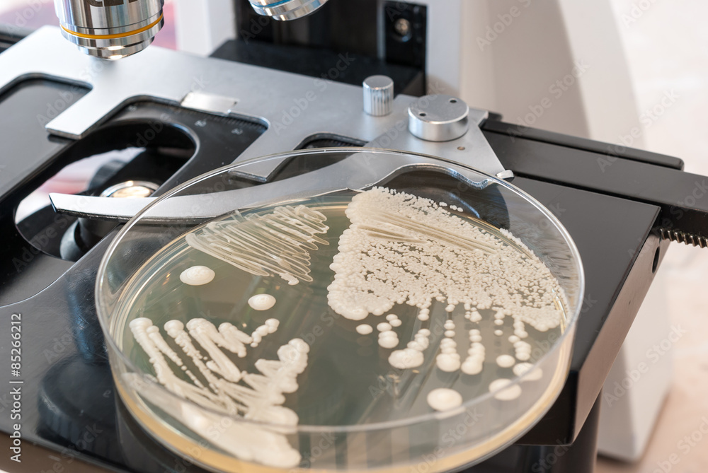 Petri dish with fungus on laboratory microscope. Candida albicans fungus on agar dish