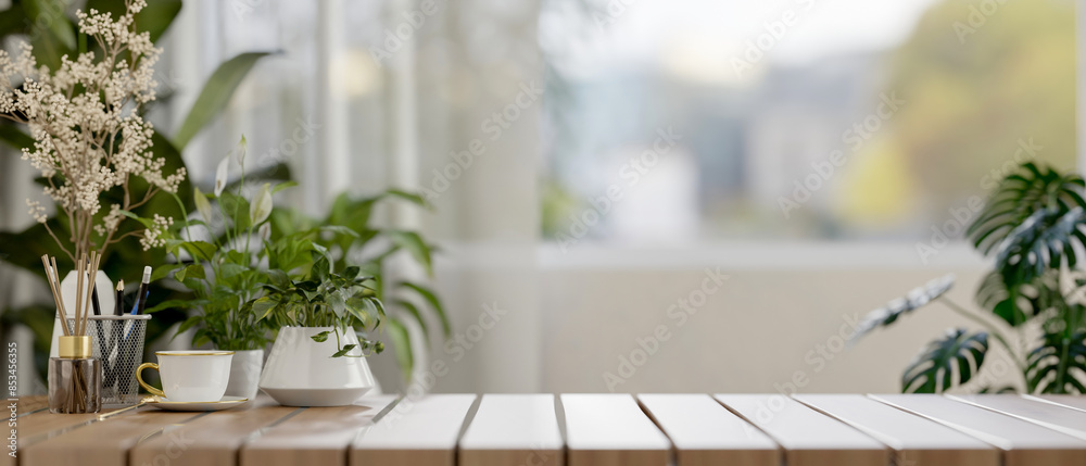 A space for showcasing products on a wooden table in a comfortable room full of houseplants.