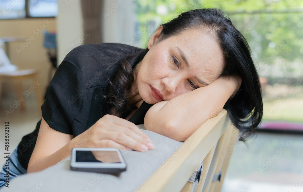 Jealous woman sitting on sofa looking phone feeling sad waiting for call