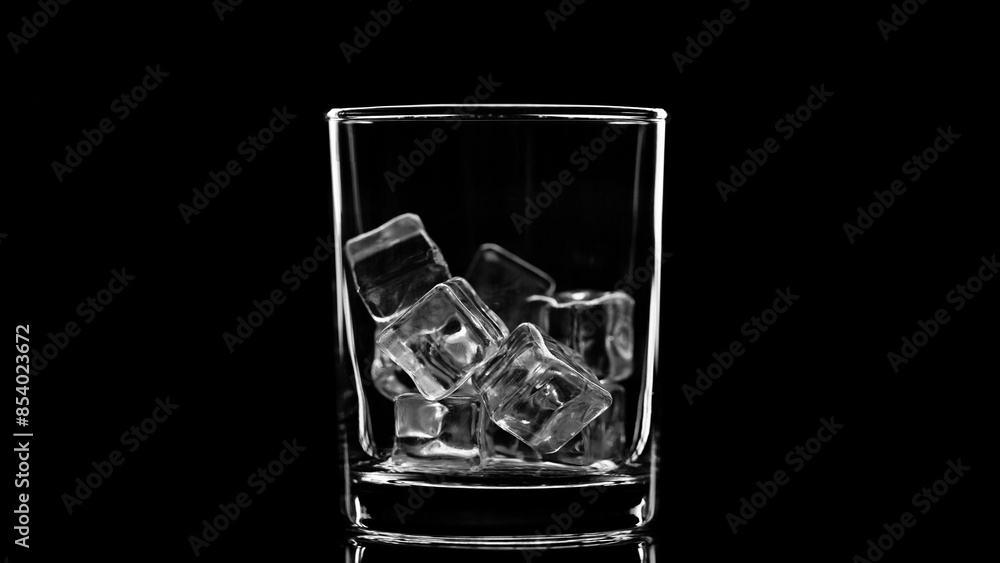 Empty transparent glass for alcoholic drinks, cocktails, lemonade or juice with ice cubes on black background in dark. Tableware for cool refreshing beverage on bar counter