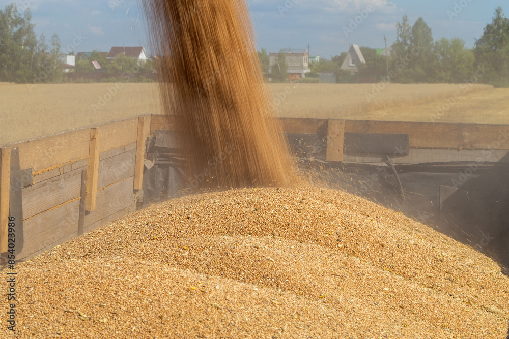 Combine Harvester Fill Grain closeup in Car Body on Wheat Field. Combine Harvester Working on Farm. Seasonal Harvesting. Agriculture, Farmland, Hayfield, Highest Yield.