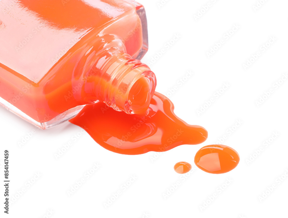 Bottle and spilled orange nail polish isolated on white