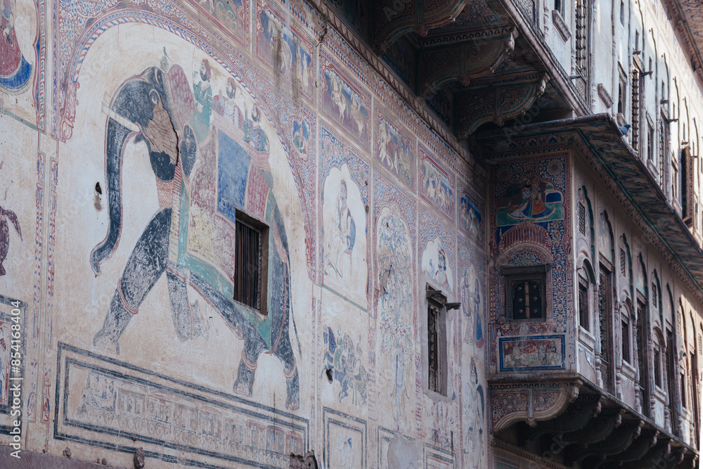 Vibrant wall painting of Rajasthani havelis in traditional Indian style, showcasing rich cultural heritage