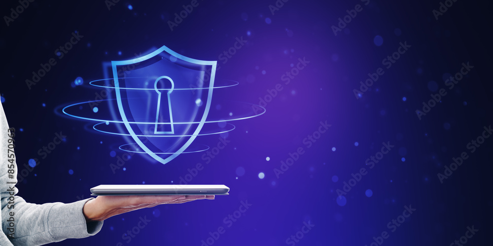 Close up of female hand holding tablet with creative digital security hologram on purple backdrop with mock up place. Web protection concept.