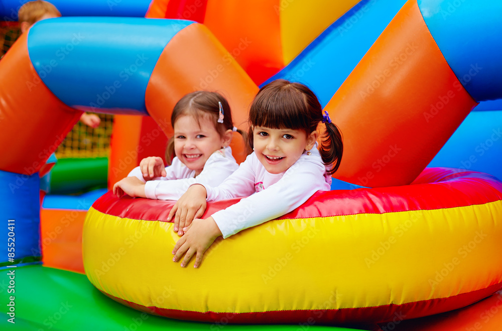 happy kids, girls having fun on inflatable attraction playground